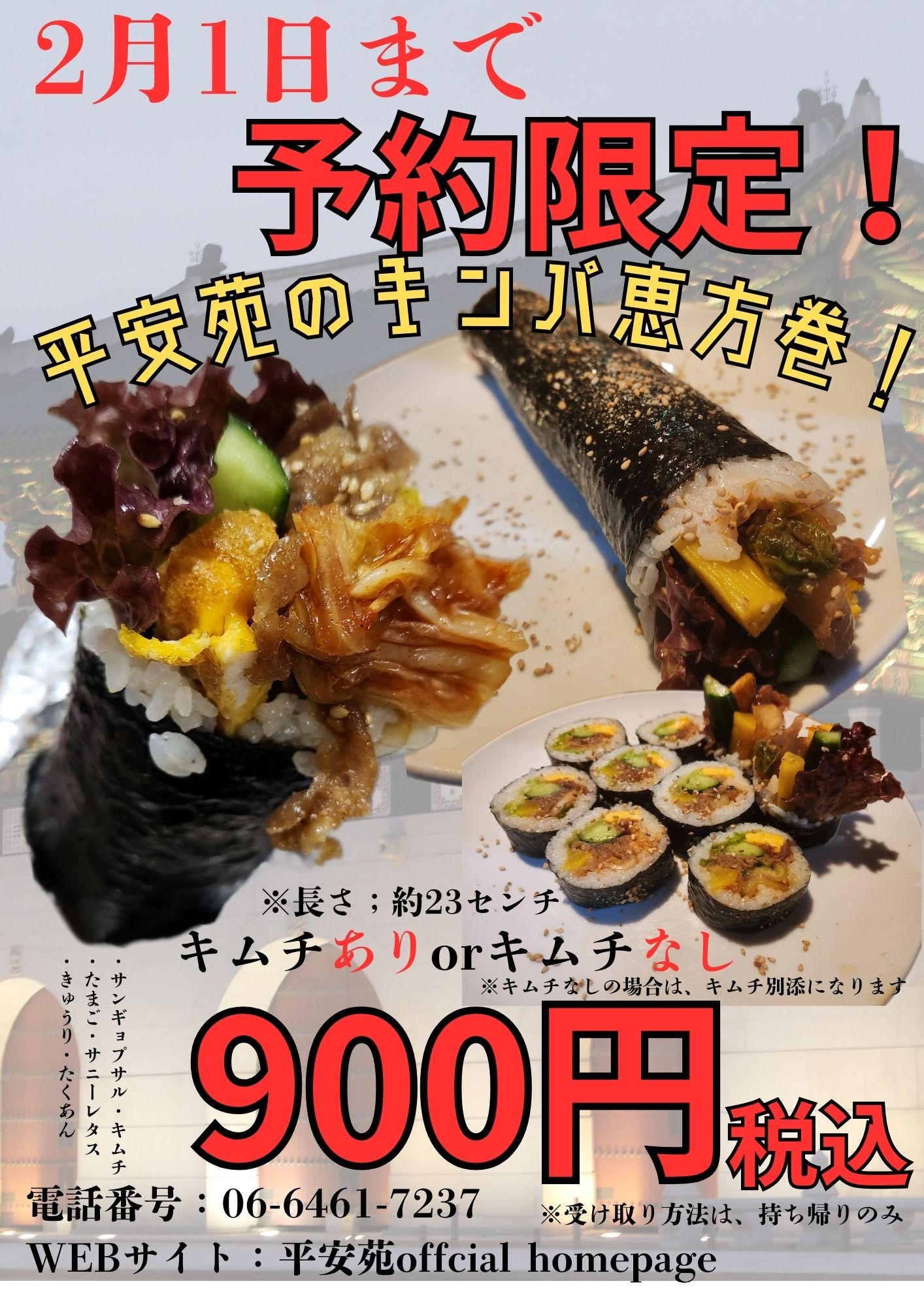 2026年2月1日までに、ご予約可能な限定 平安苑のキンパ恵方巻です!